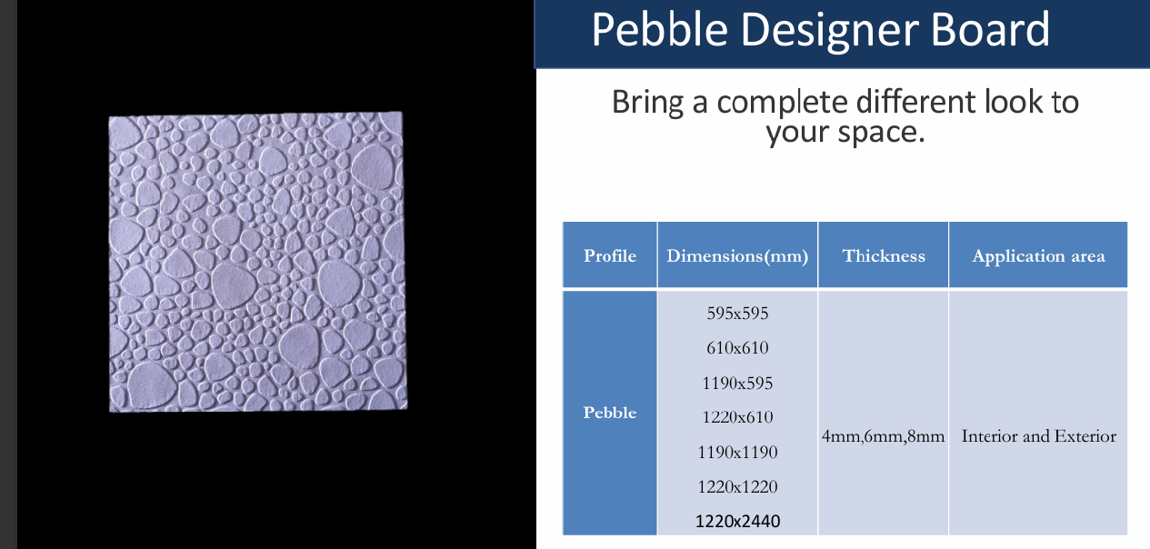 Using latest technology, the EcoPro boards are manufactured in various textured surface finishes.